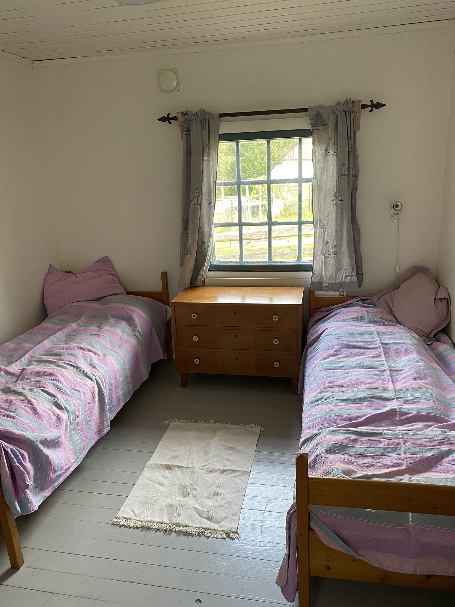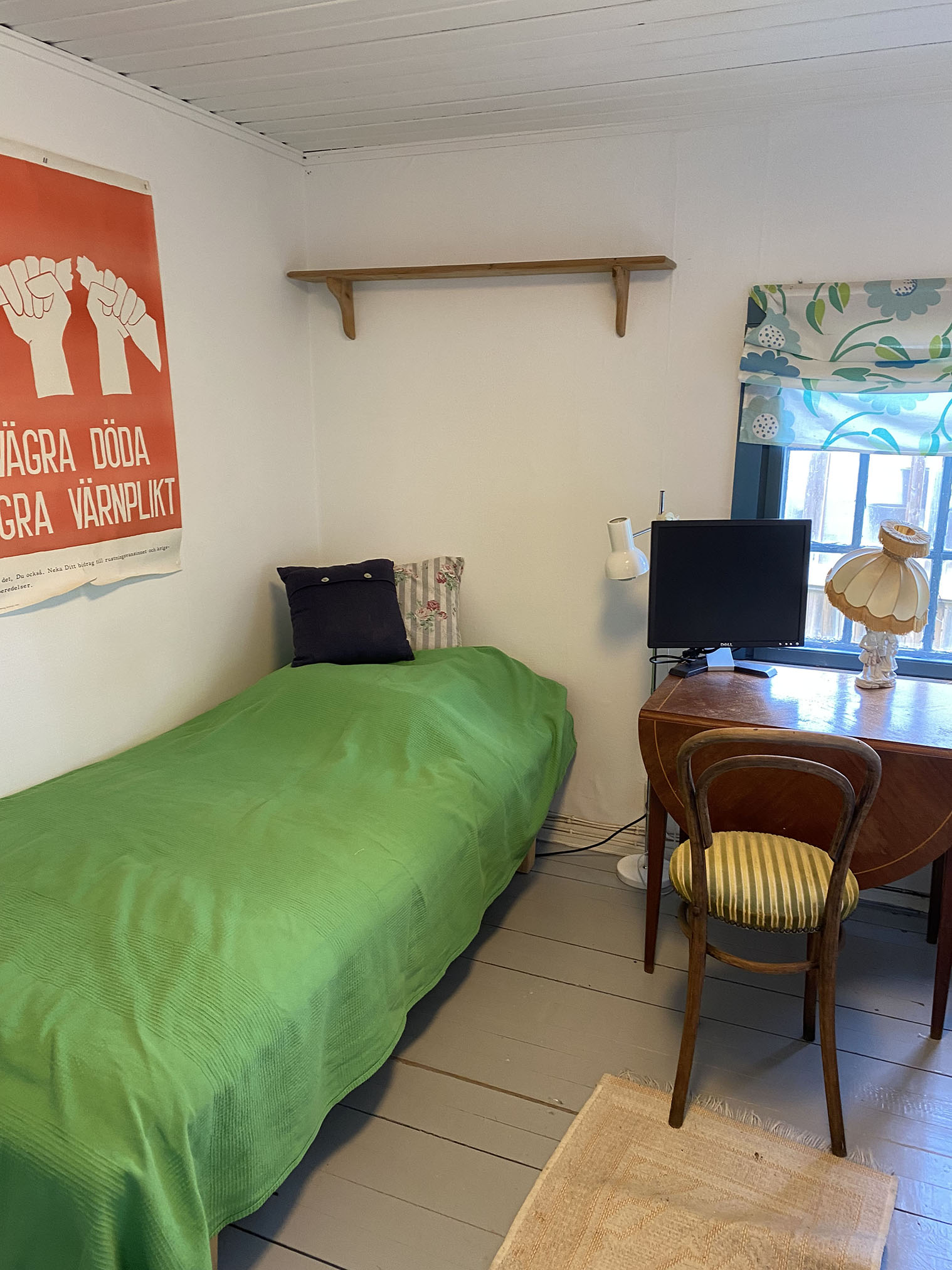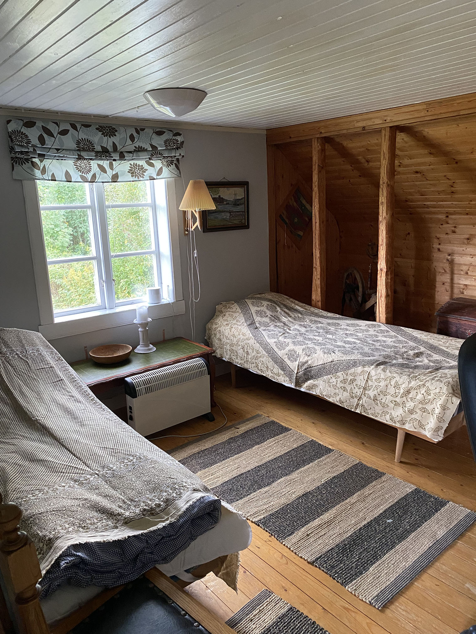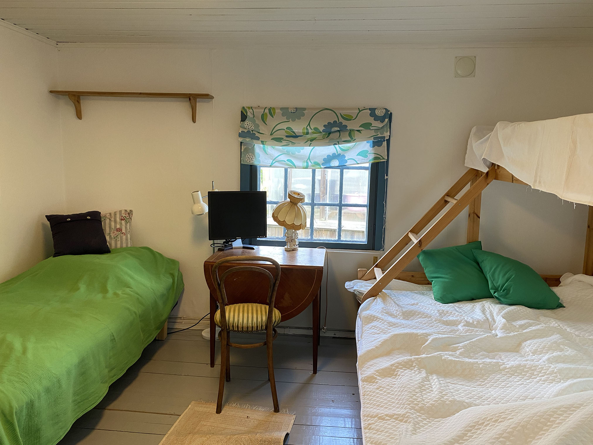 Stellans rum (uppkallat efter en av våra återkommande gäster) har ett skrivbord och två enkelsängar, varav den ena nästan rymmer två personer (120 cm bred).