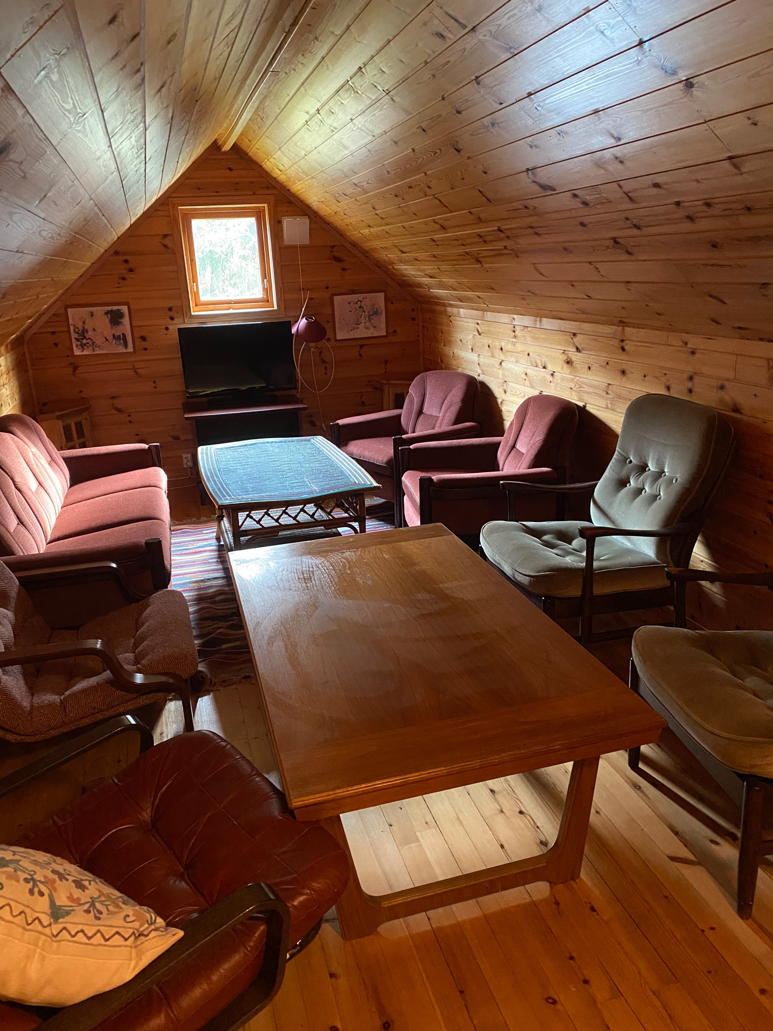 På övervåningen finns ett vardagsrum med soffa och fåtöljer för cirka tio personer, som kan användas för arbete i mindre grupper eller avkoppling på kvällen.